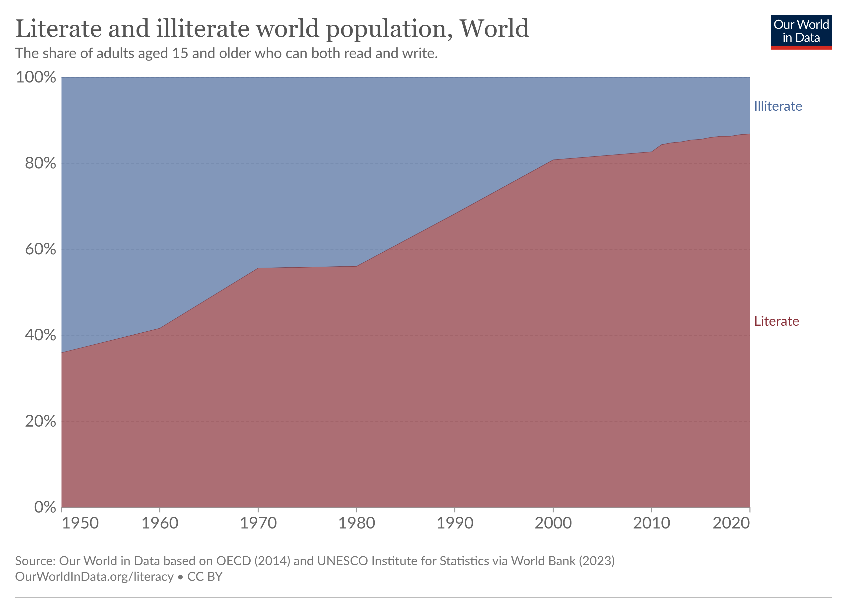 Consider the prospects for children born today versus 75 years ago: beyond the far greater chance that they will survive their first few years, it’s much less likely that they will be forced to work and more likely that they will receive an education. In 1950, the average child could expect to receive just over three years of schooling — a number that had almost tripled to 8.5 by 2015. While just 36 percent of the world’s population was literate in 1950, this proportion is now 87 percent.