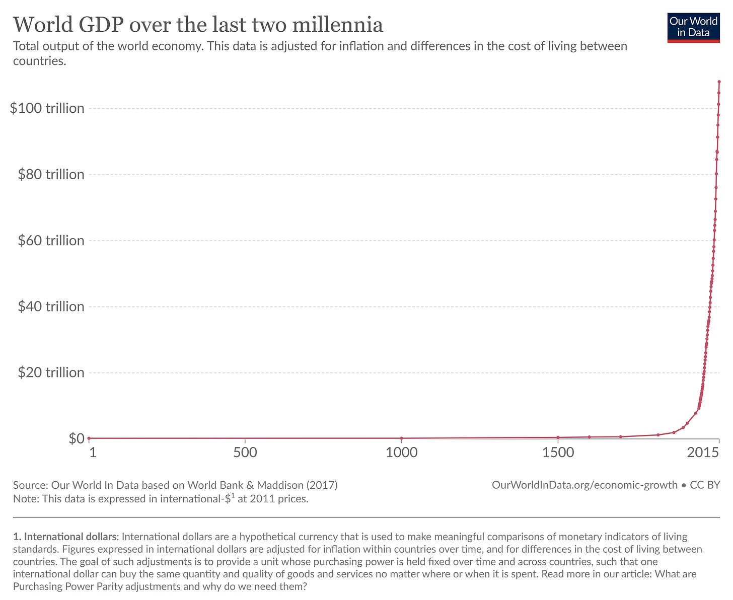 Of course, the explosion in global wealth and human well-being didn’t begin in 1989. Perhaps the most inspiring graph ever produced is this one (published by Our World in Data) which tracks global GDP over the past 2,000 years: