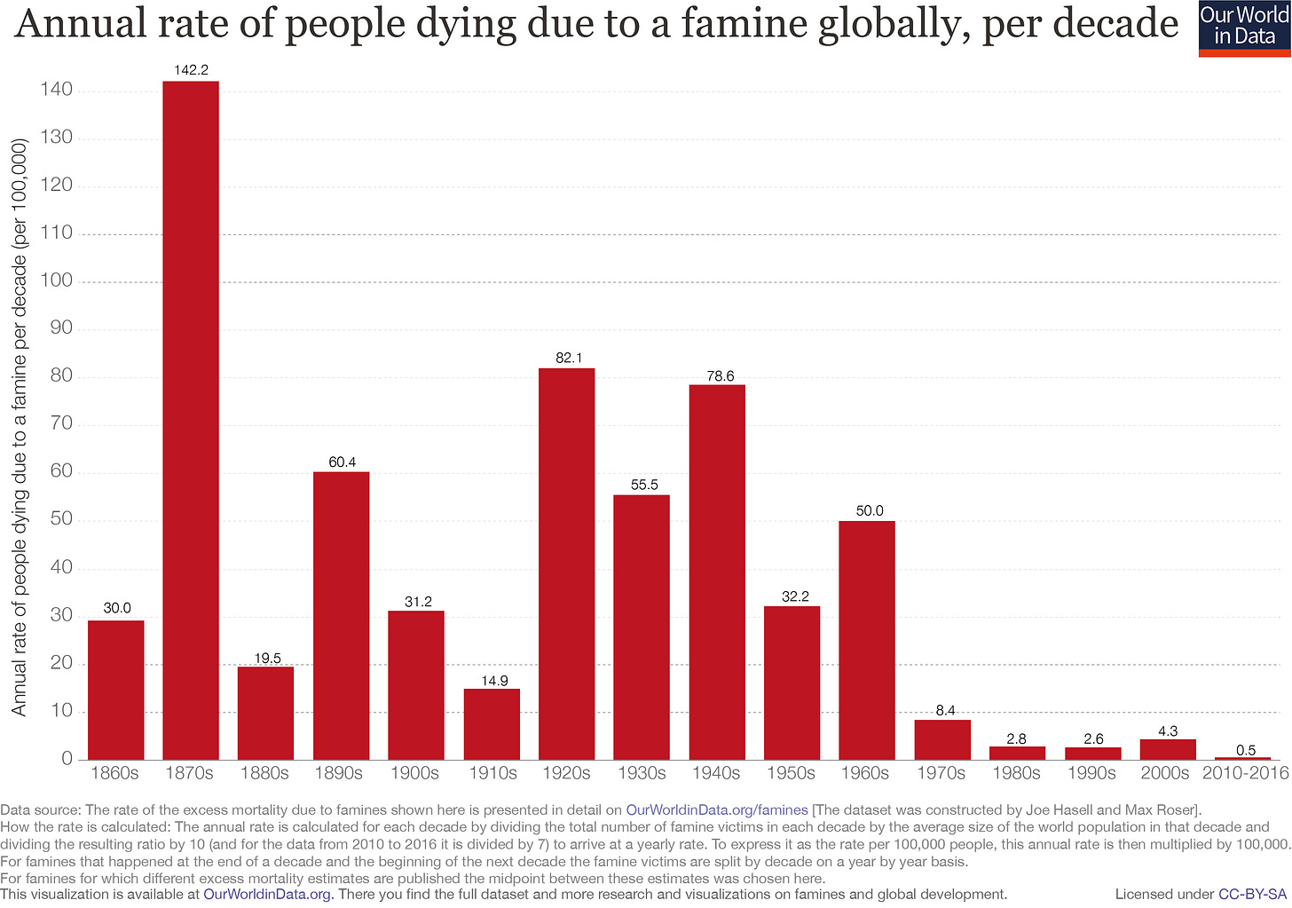 As global wealth has soared, inequality has declined. While inequality has risen in some rich countries like the United States, incomes in many “developing” countries have grown at a faster rate than incomes in their “developed” counterparts (which is one of the reasons the developing-developed dichotomy makes less and less sense). As this economic abundance becomes more widely available, the global division of labor becomes increasingly efficient, and technology around transportation, storage, production, etc. continues to improve, many of our species’ oldest enemies (such as famines) may not be long for this world. While food insecurity remains a major global issue and famines still occur (in North Korea, the Democratic Republic of Congo, and Sudan, for instance), the improvement over the past 75 years is unmatched in human history. Paul Ehrlich’s infamous “population bomb” — a thesis which assumed that global population growth would inevitably outstrip food production — never detonated.